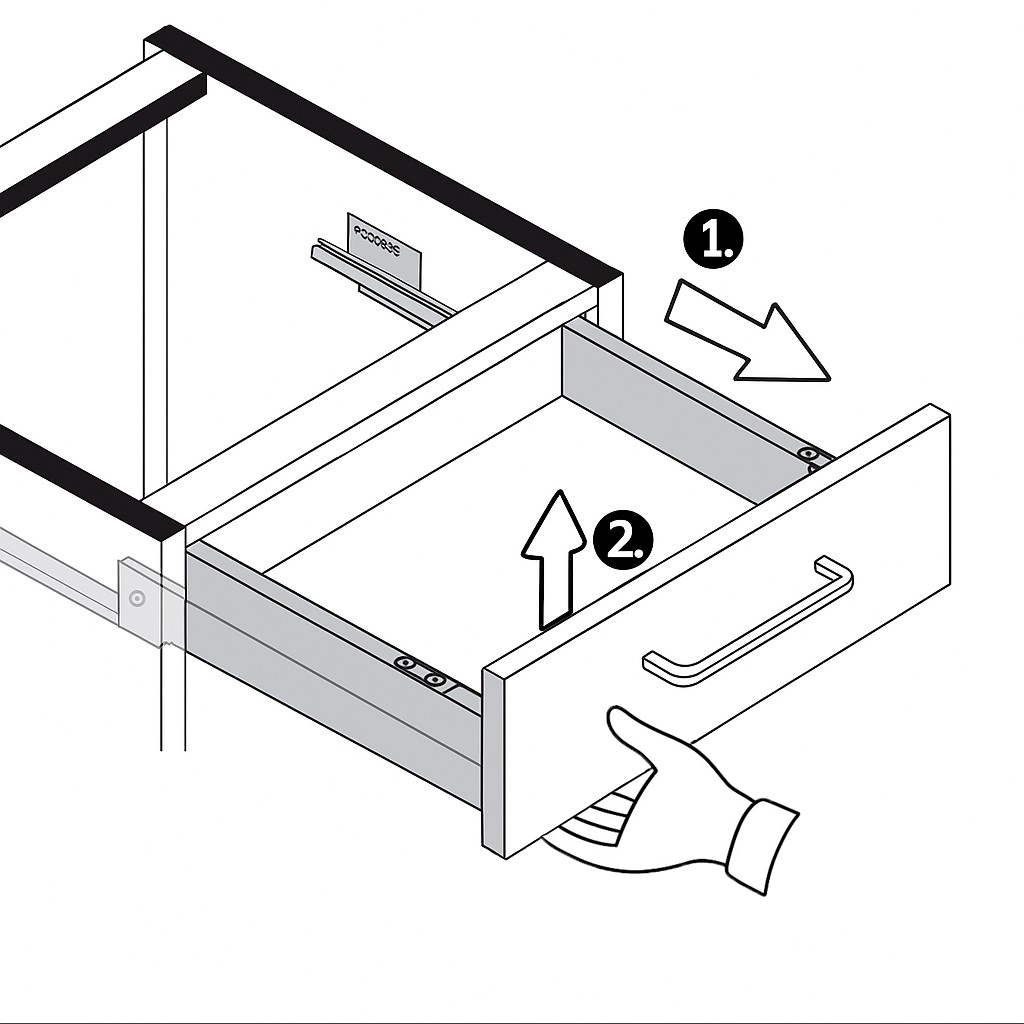 Um die Schublade aus den Führungsschienen zu lösen, ziehen Sie die Schublade bis kurz vor den Anschlag heraus. Sie greifen mit einer Hand unter die Front und heben die Schublade mit einem kräftigen Aufwärtsstoß senkrecht nach oben an. Bitte beachten Sie: Beim ersten Lösen kann der Widerstand sehr stark sein und es kann dabei ein lautes Geräusch entstehen. Dies ist normal und bedeutet nicht, dass etwas beschädigt wird. Sobald sich der Mechanismus gelöst hat, können Sie die Schublade vollständig herausnehmen.